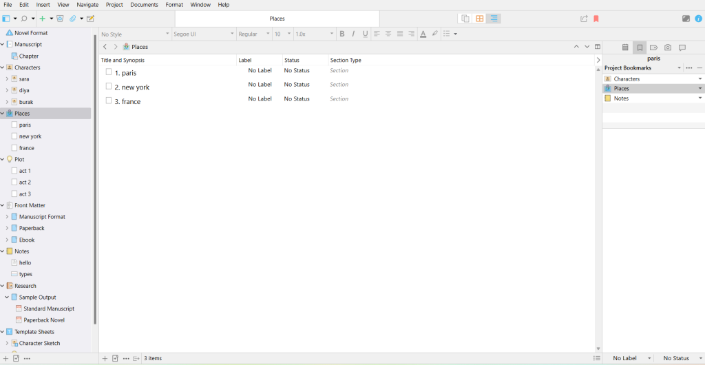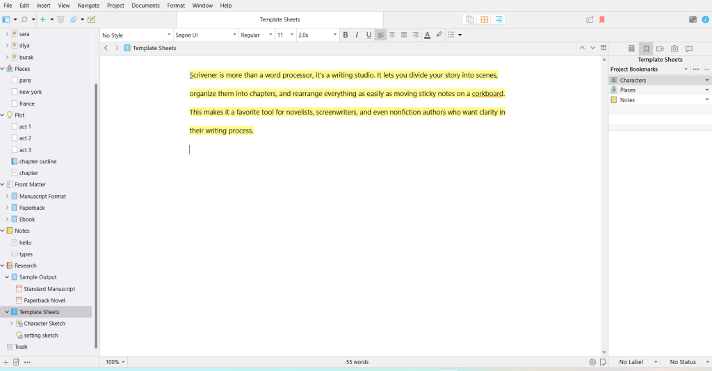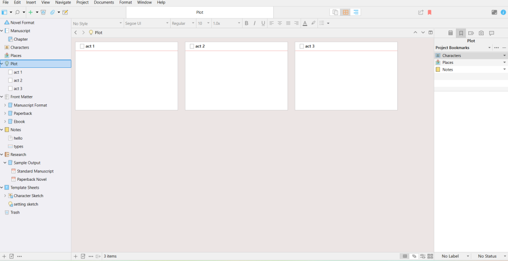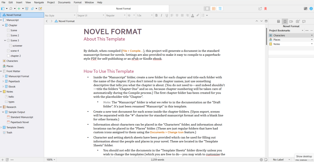 Scrivener comes with ready-made templates designed for different genres and formats. The Fiction Template is especially useful because it provides a pre-structured outline with space for characters, settings, and scenes. It’s a great starting point if you are new to plotting and don’t want to reinvent the wheel.