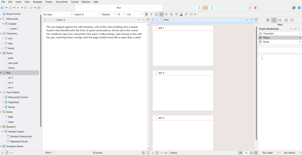 Scrivener is more than a word processor, it’s a writing studio. It lets you divide your story into scenes, organize them into chapters, and rearrange everything as easily as moving sticky notes on a corkboard. This makes it a favorite tool for novelists, screenwriters, and even nonfiction authors who want clarity in their writing process.